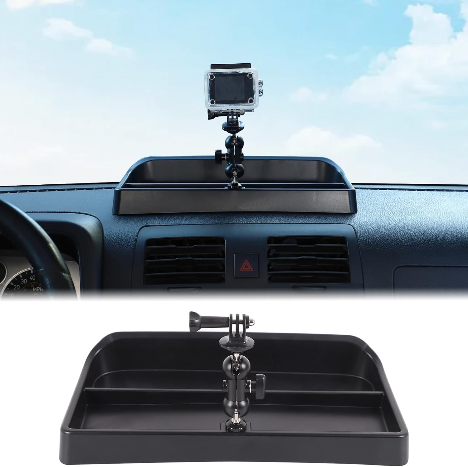 The Aunginsy Center Console Dashboard is a multifunctional storage tray and dash cam mount holder designed exclusively for the Hummer H3 models from 2005 to 2009. It replaces or enhances the existing center console storage area with a structured, elevated tray that provides compartments for small items like phones, keys, sunglasses, and charging cables. Integrated into the design is a robust dash cam mount that attaches directly to the tray, allowing you to securely mount your action camera or dash cam without drilling holes or using unreliable suction cups.